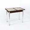 Длина прямоугольной столешницы - 90 см, с помощью механизма “бабочка” ее можно еще немного увеличить - до 1 м 20 см. Изготовлена она из сочетания ЛДСП и МДФ, сверху - закаленное окрашенное стекло. Возможны варианты с кожзамом, фотопечатью. Ноги прямые или гнутые, могут быть сделаны из хромированной стали или массива березы белого, кремового или цвета венге. В любой комбинации служат надежной опорой изделию даже в разложенном виде.